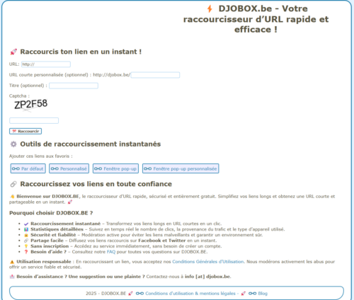 DJOBOX.BE est un raccourcisseur d’URL rapide, gratuit et sans inscription. Obtenez un lien court en un clic, générez automatiquement un QR Code et accédez à des statistiques détaillées sur vos liens (clics, pays, appareils). Idéal pour un partage simple et efficace sur le web et les réseaux sociaux !